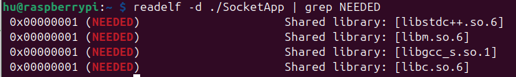readelf -d ./SocketApp | grep NEEDED 명령어로 확인했더니 아래와 같은 결과가 나왔다.