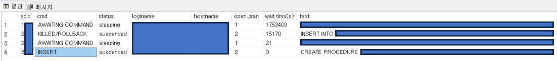 : 열려 있는 트랜잭션의 수datediff(s, p.last_batch, getdate()) as [wait tims(s)]