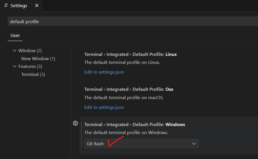 2. Terminal › Integrated › Default Profile: Windows 옵션 변경