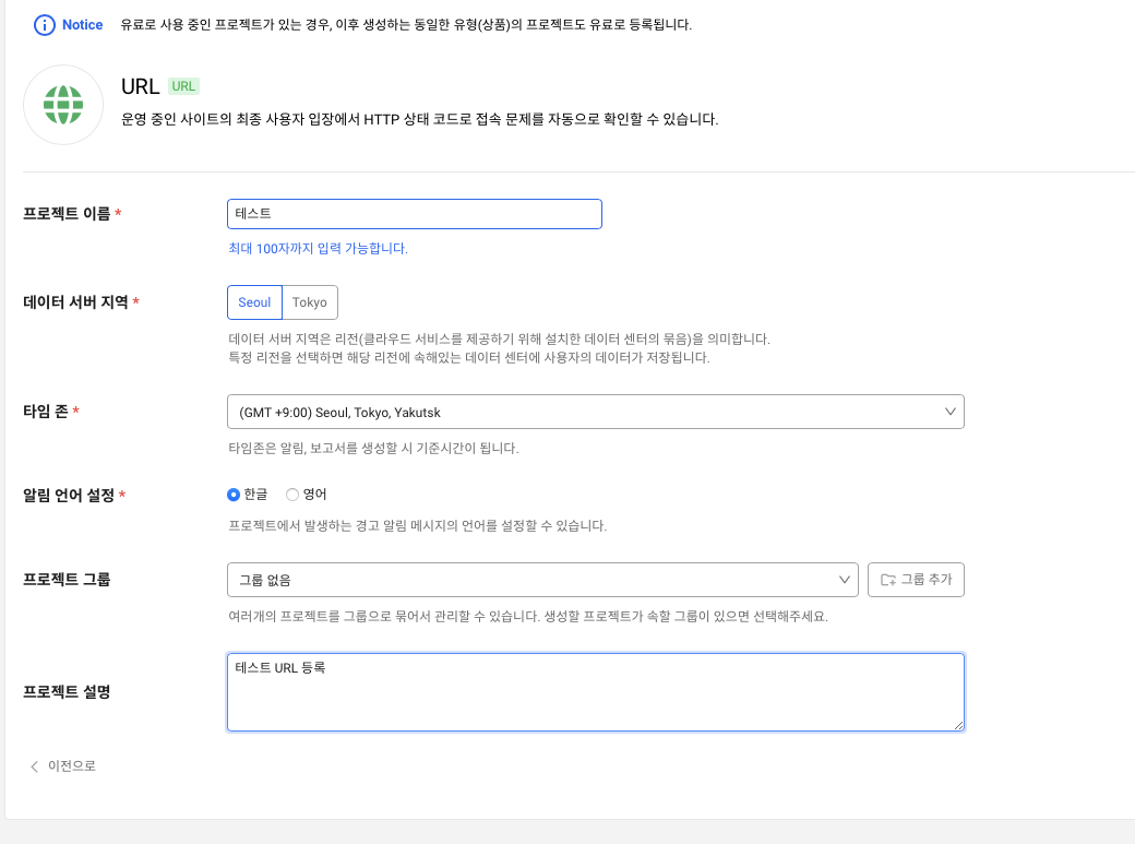 • 데이터 서버 지역: 모니터링 데이터가 저장될 리전 선택 (국내 서비스라면 서울 선택 권장)
