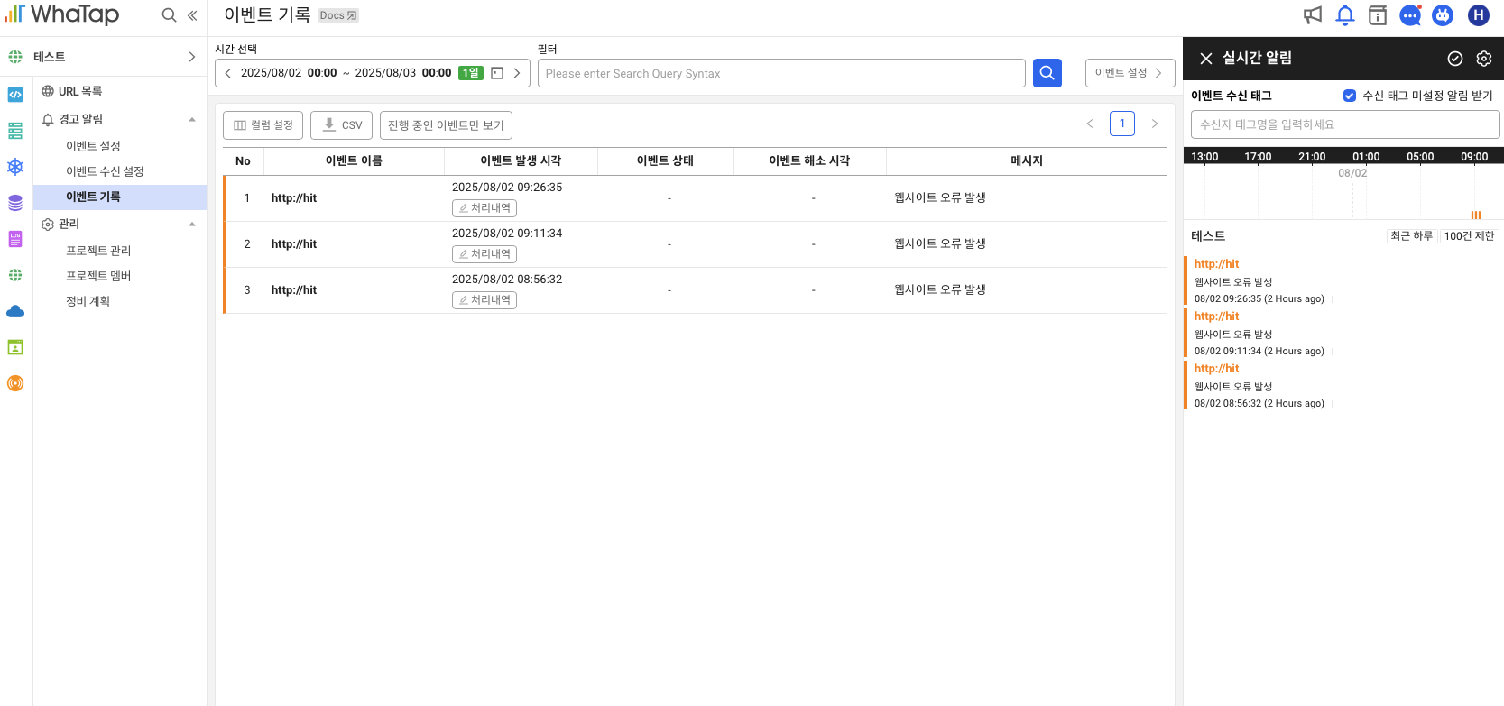 사이트 내 대시보드 경고 알림 > 이벤트 기록 메뉴로 접속 시