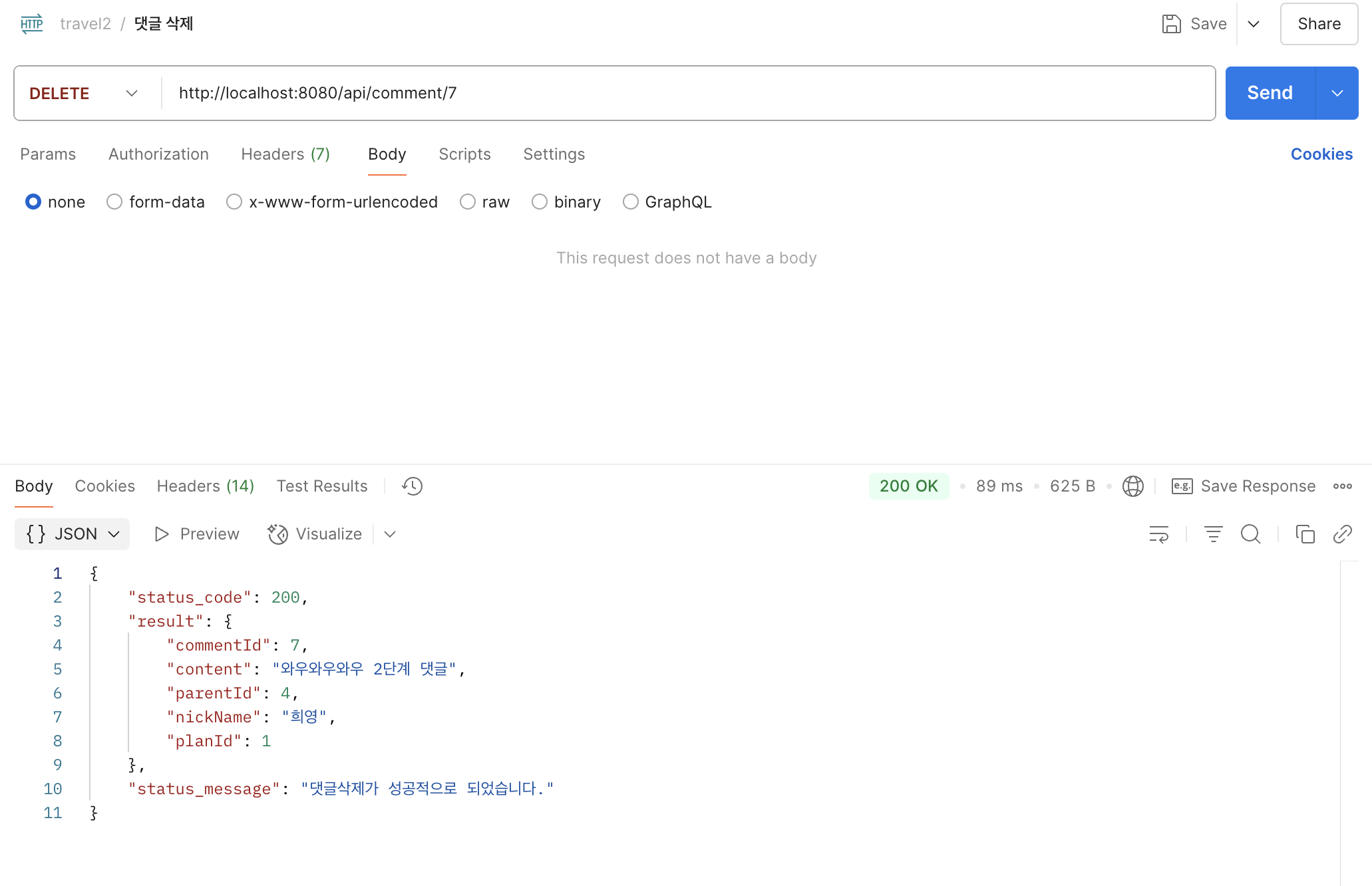 삭제 API를 통해 DB에서 데이터가 잘 삭제되는 걸 확인할 수 있다.