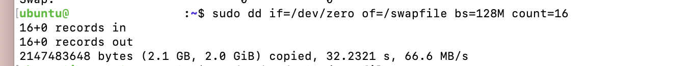 sudo dd if=/dev/zero of=/swapfile bs=128M count=16