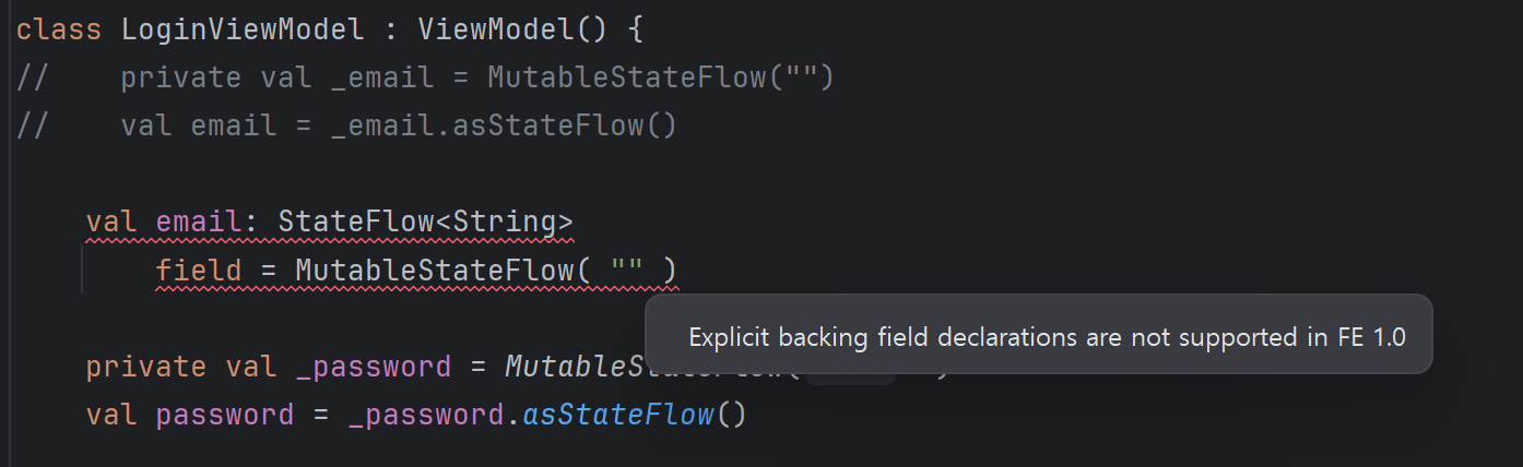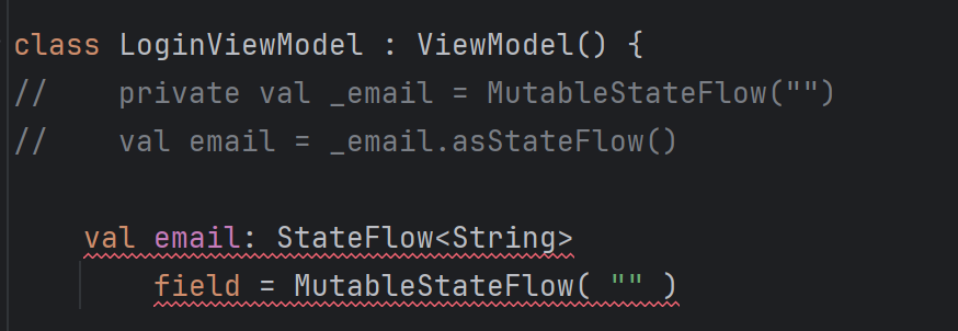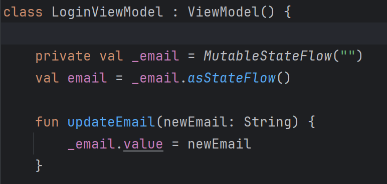 } 이렇게 예시가 있다면, 클래스 내부에서만 _email에 접근해서 데이터를 변경할 수 있고! 외부에서는 email을 통해서 읽어오기만 가능하게 되죠. 그래서 아래 updateEmail 함수 내부에서 _email.value에 newEmail을 값을 넣어주는 겁니다! (email.value가 아니라) 자세한건 공식문서들을 참고해주세여..그동안 나는 이렇게 (주석부분) backing property를 명시해왔는데..!!