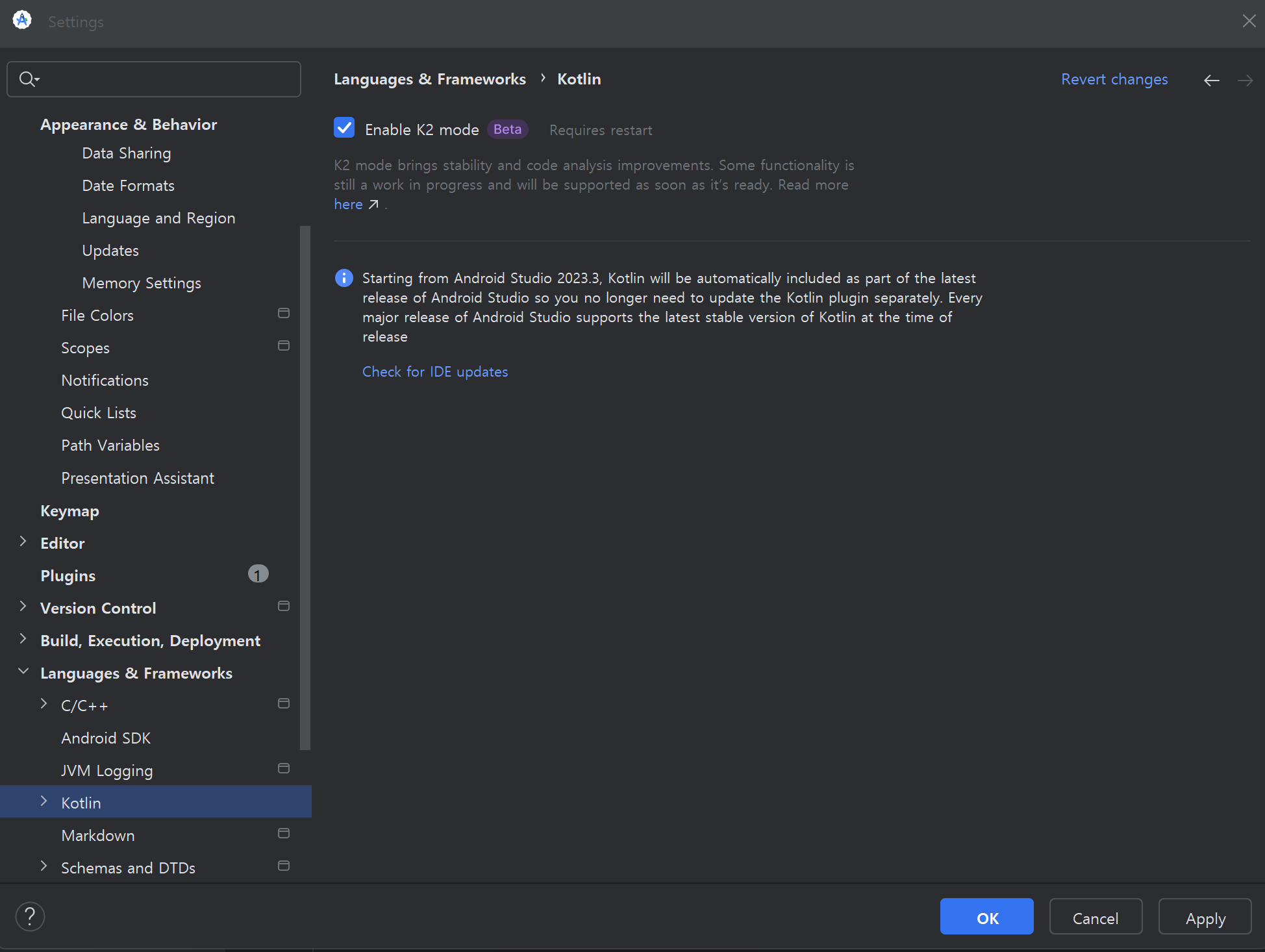 Setting > Languages & Frameworks > Kotlins > Enable K2 mode 체크!