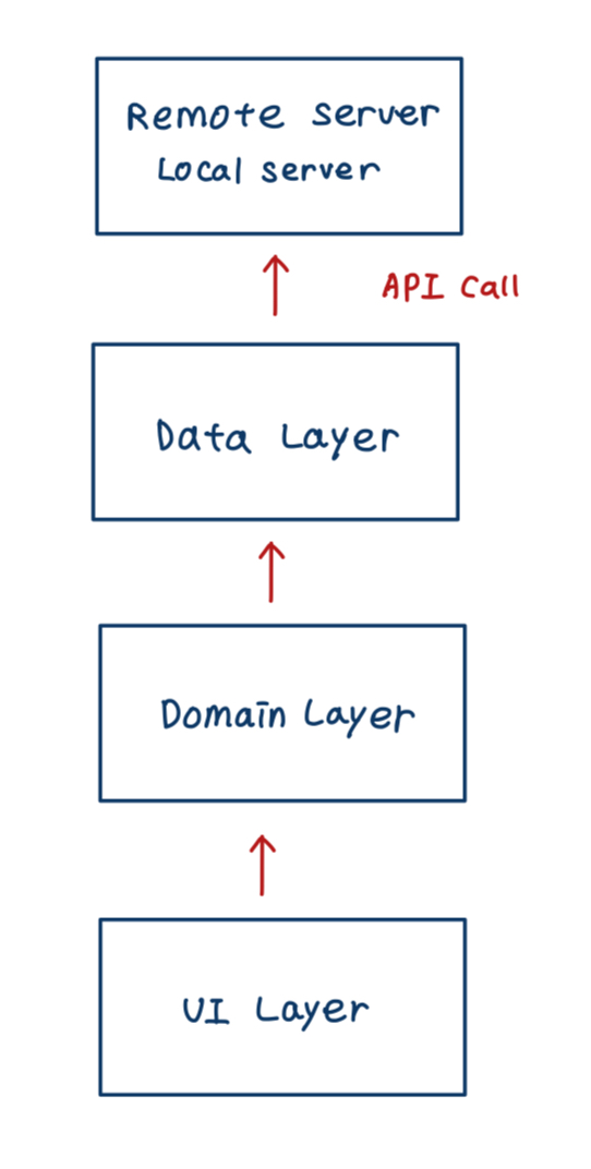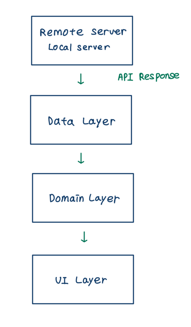 ex) Remote 또는 서버로부터 받은 Data → Domain → UI (하위 레이어로 전달)