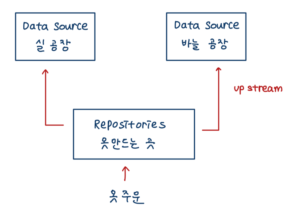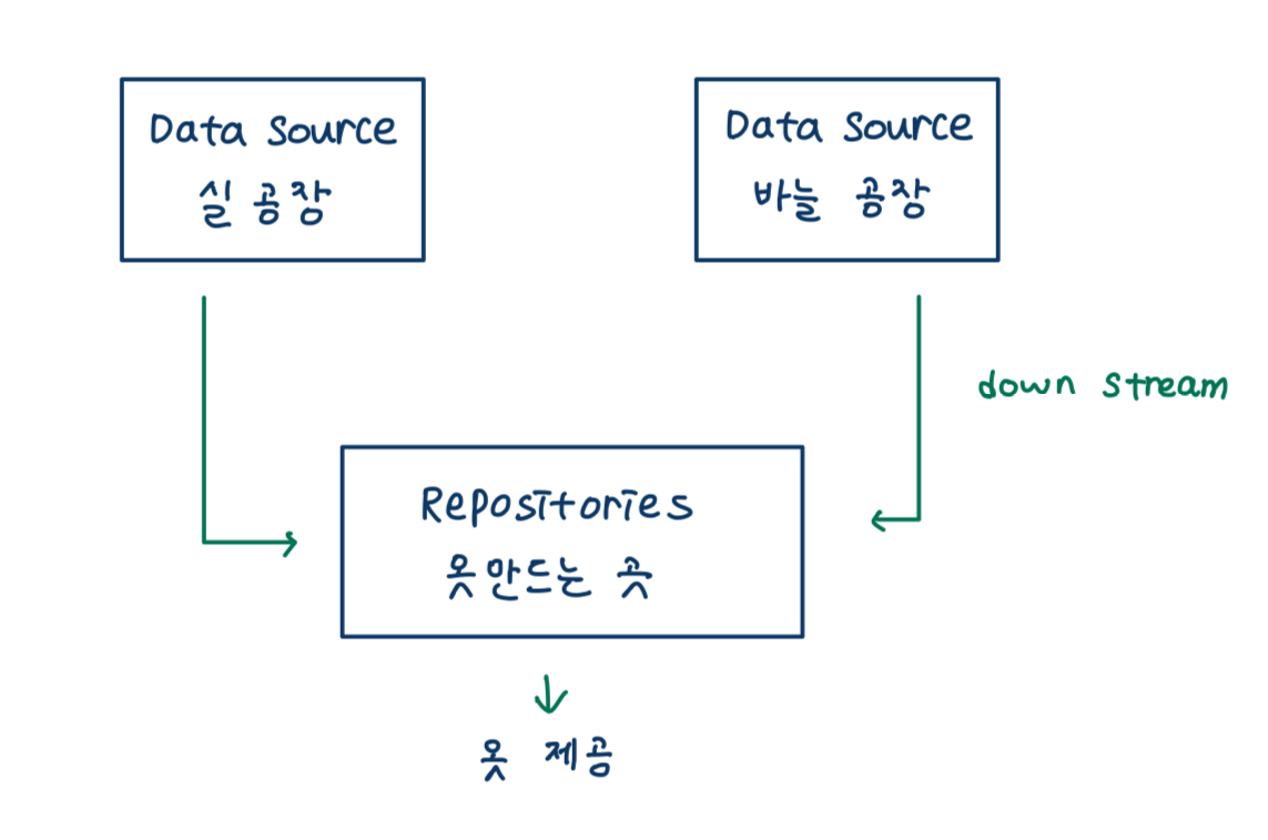 즉, DataSource는 서버로부터 받은 데이터를 Repository로 보내고 Repository는 받은 데이터를 가공하여 하위 레이어로 보내주는 역할을 한다.