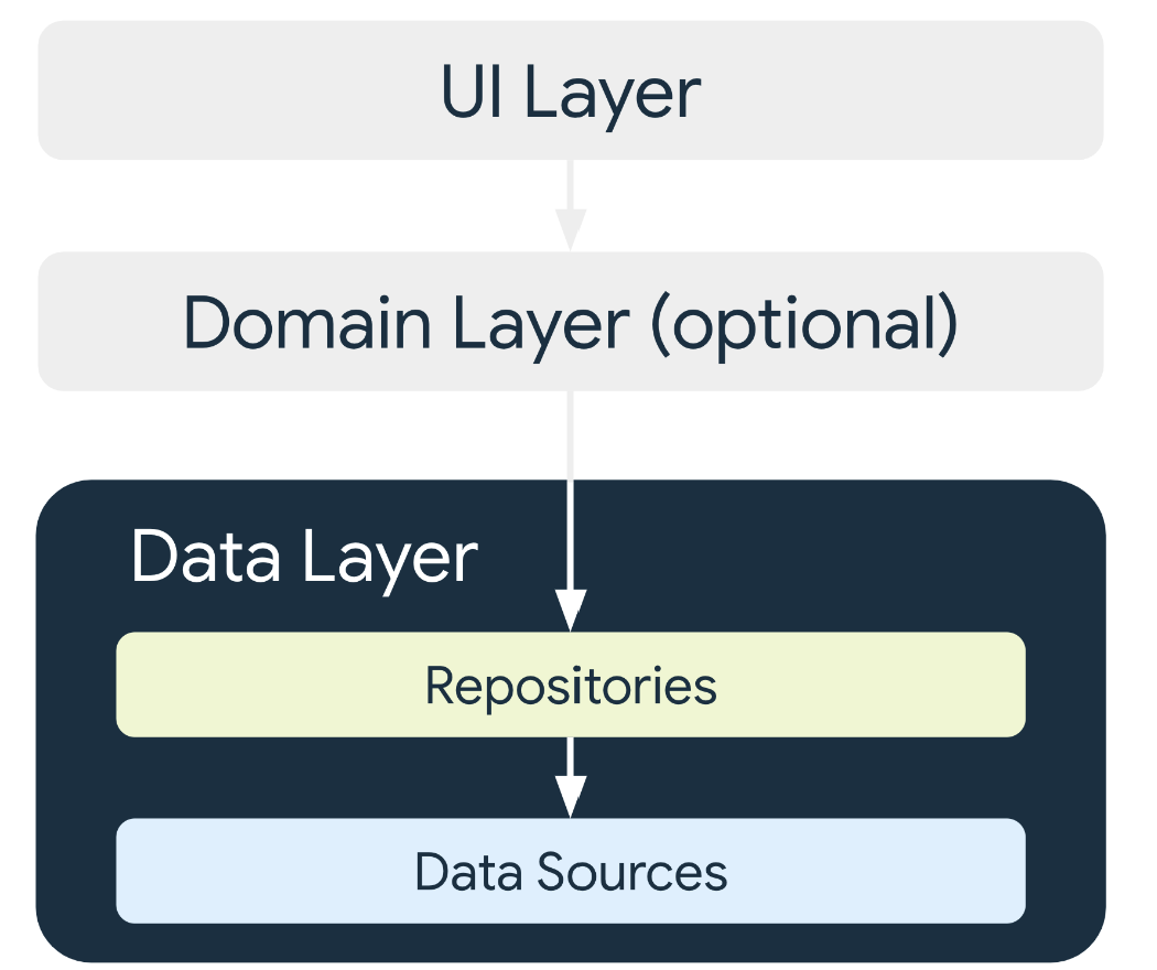 데이터 레이어는 0개부터 데이터 소스를 포함할 수 있는 저장소로 구성된다. 앱에서 데이터를 처리하는 다양한 유형별로 저장소 클래스를 만든다. (각 유형별로 맞는 데이터 클래스가 생긴다는 것)