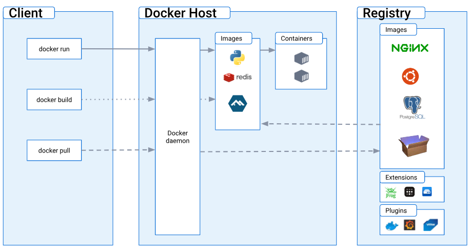 - Docker Client는 컨테이너 빌드, 실행 및 배포하는 Docker Demon과 통신