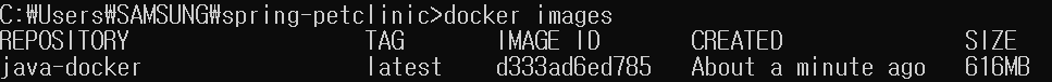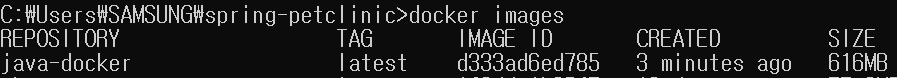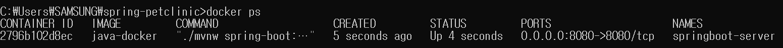 $ docker run --rm -d --name springboot-server --network mysqlnet -e MYSQL_URL=jdbc:mysql://mysqlserver/petclinic -p 8080:8080 java-docker