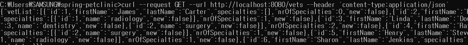 $ curl --request GET --url http://localhost:8080/vets --header 'content-type:application/json'
