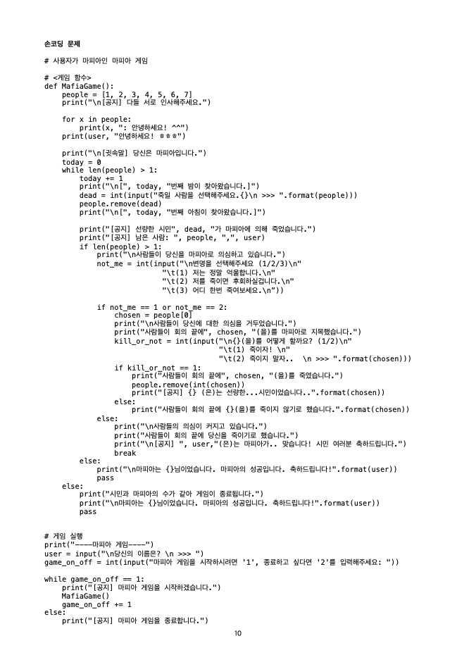 파이썬에서 배운걸 토대로 아무 코드나 만들어서 손코딩으로 제출하는게 과제였다. 지금 보면 웃기지만 ㅋㅋㅋㅋㅋㅋ 터미널에서 할 수 있는 마피아 게임을 만들었었다.