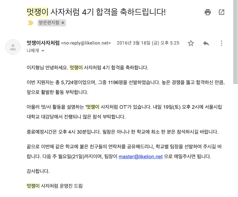 해외 스타트업의 성공 사례를 관심있게 지켜보고, 나도 미래엔 저런 공동체에서 디자이너로 일하고 싶다는 소망을 꿈꿔왔기 때문에 언젠가는 코딩을 배워야한다고 생각해왔다. 2016년, 1년의 휴학 후 학교로 복학한 나는 새로운 마음 가짐으로 멋쟁이 사자처럼 프로그램에 지원하였고, 합격하였다.