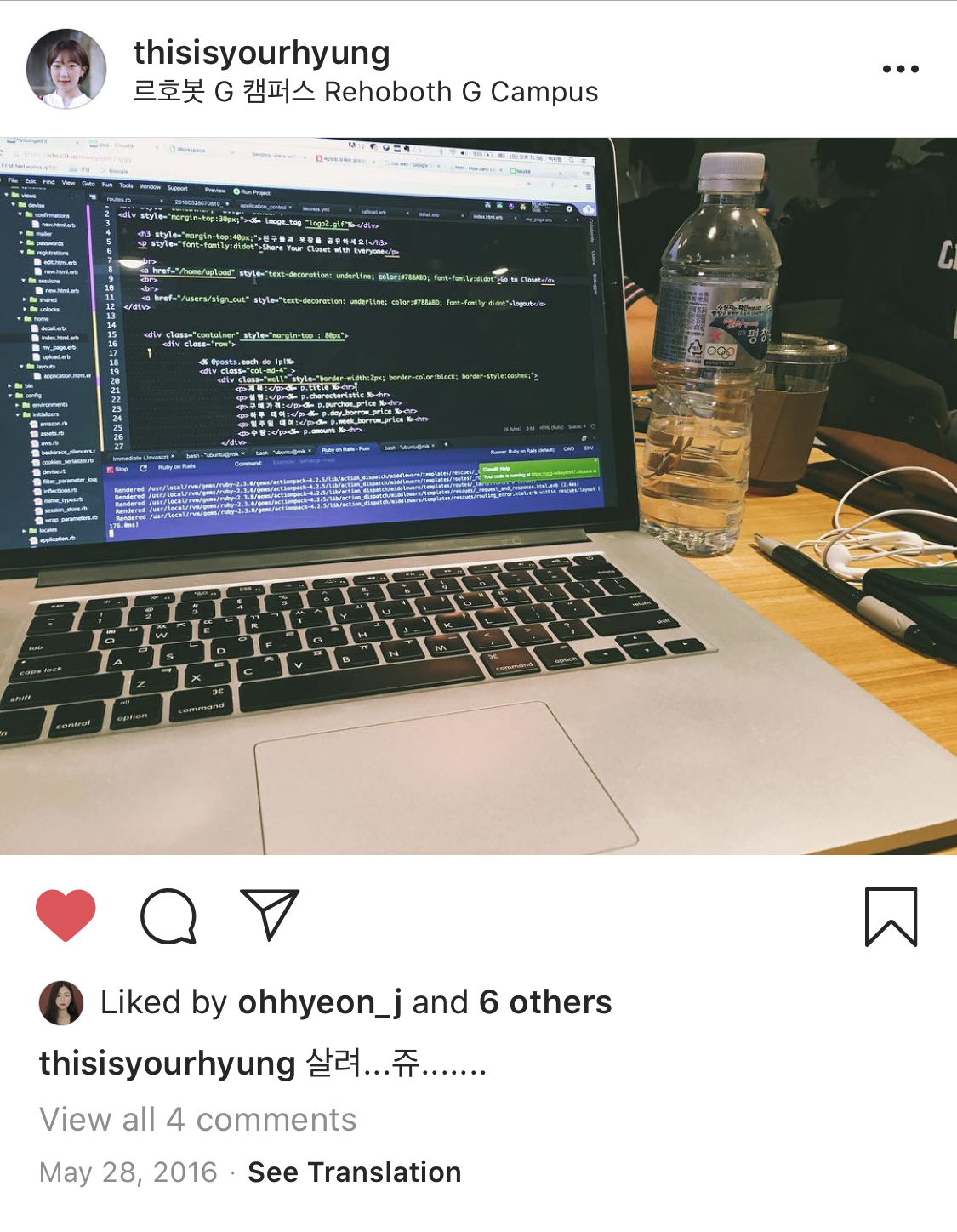위 포스팅은 한 달 간 진행된 피어러닝 후 실시했던 신촌지역 대학생 연합 해커톤이었다. 당시 배우는 언어는 Ruby였는데, 왠지 우리 학교의 멘토들이 나와 다른 디자인과 친구에게는 HTML, CSS만 가르쳐 준 기억이 난다. 허접한 결과물을 보고는 내 길이 아닌가 싶어 해커톤을 마지막으로 나는 더 이상 모임에 나가지 않았다.