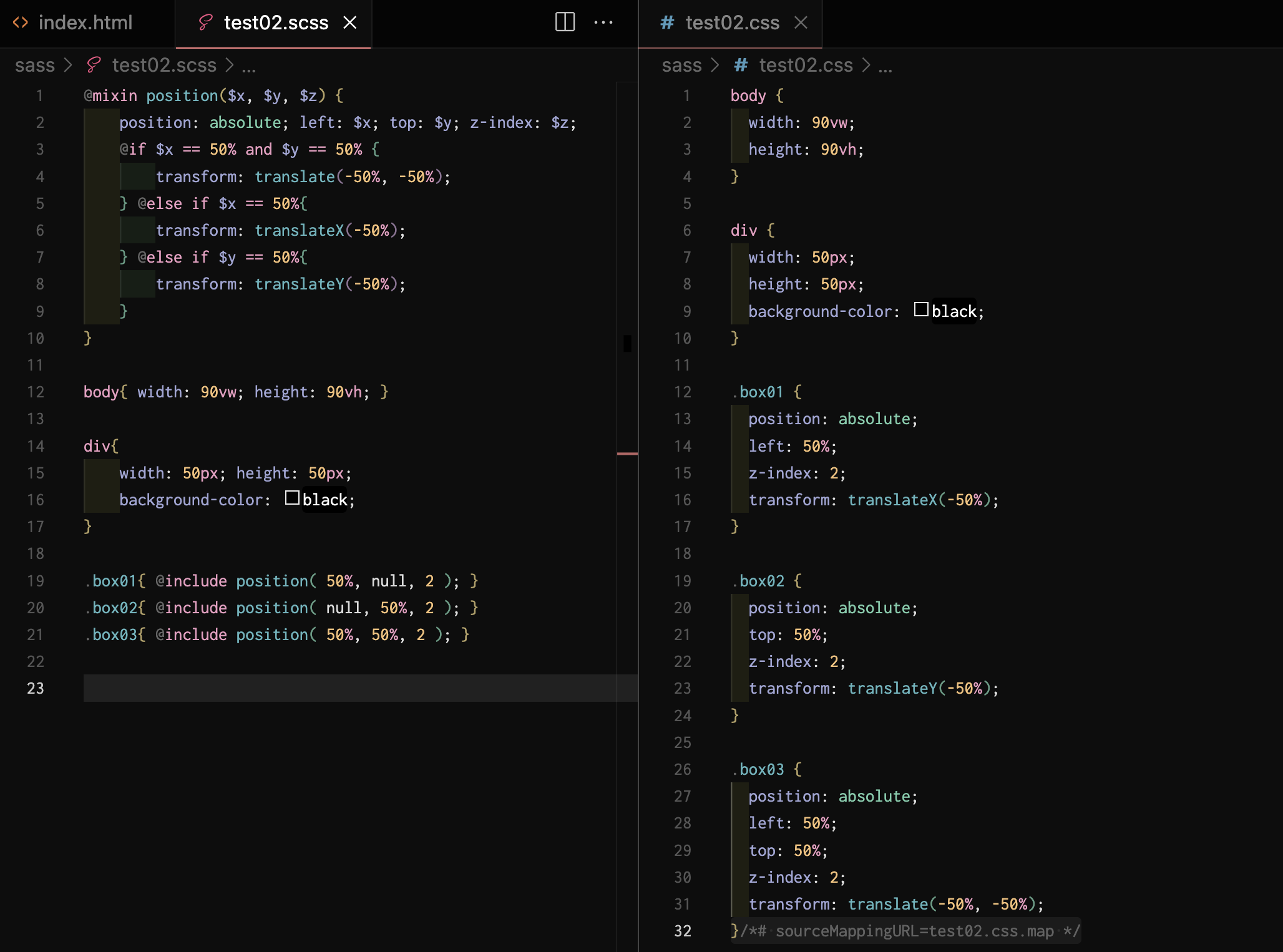 - box01은 $x가 50%일 때, box02은 $y가 50%일 때, box03은 $x와 $y가 각각 50%일 때의 스타일을 적용받는다.