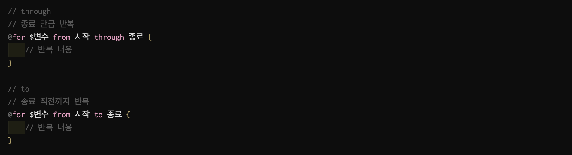 - @each {현재 요소를 가리키는 이름} in {변수 이름}