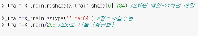 28x28의 배열을 784개의 1차원 배열로 바꿔줘야 함->reshape() 사용