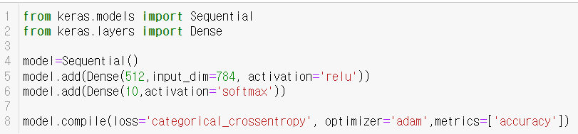 입력층: 노드 512개, 입력값은 784개 속성값, 활성화 함수-렐루함수