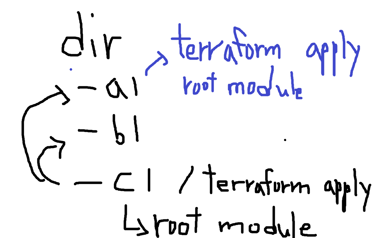 위의 그림처럼 디렉토리에 a,b,c 디렉토리(모듈)가 있고 c모듈이 a,b 모듈을 가져다 쓴다고 했을 때 c에서 terraform apply를 수행하게 된다고 하면 c라는 워크스페이스는 root 모듈이 되고 c가 사용하는 a,b 모듈은 child 모듈이 된다.