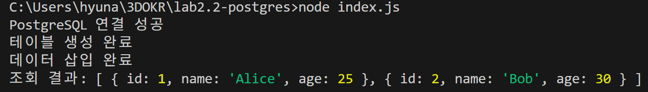 조회 결과: [ { id: 1, name: 'Alice', age: 25 }, { id: 2, name: 'Bob', age: 30 } ]