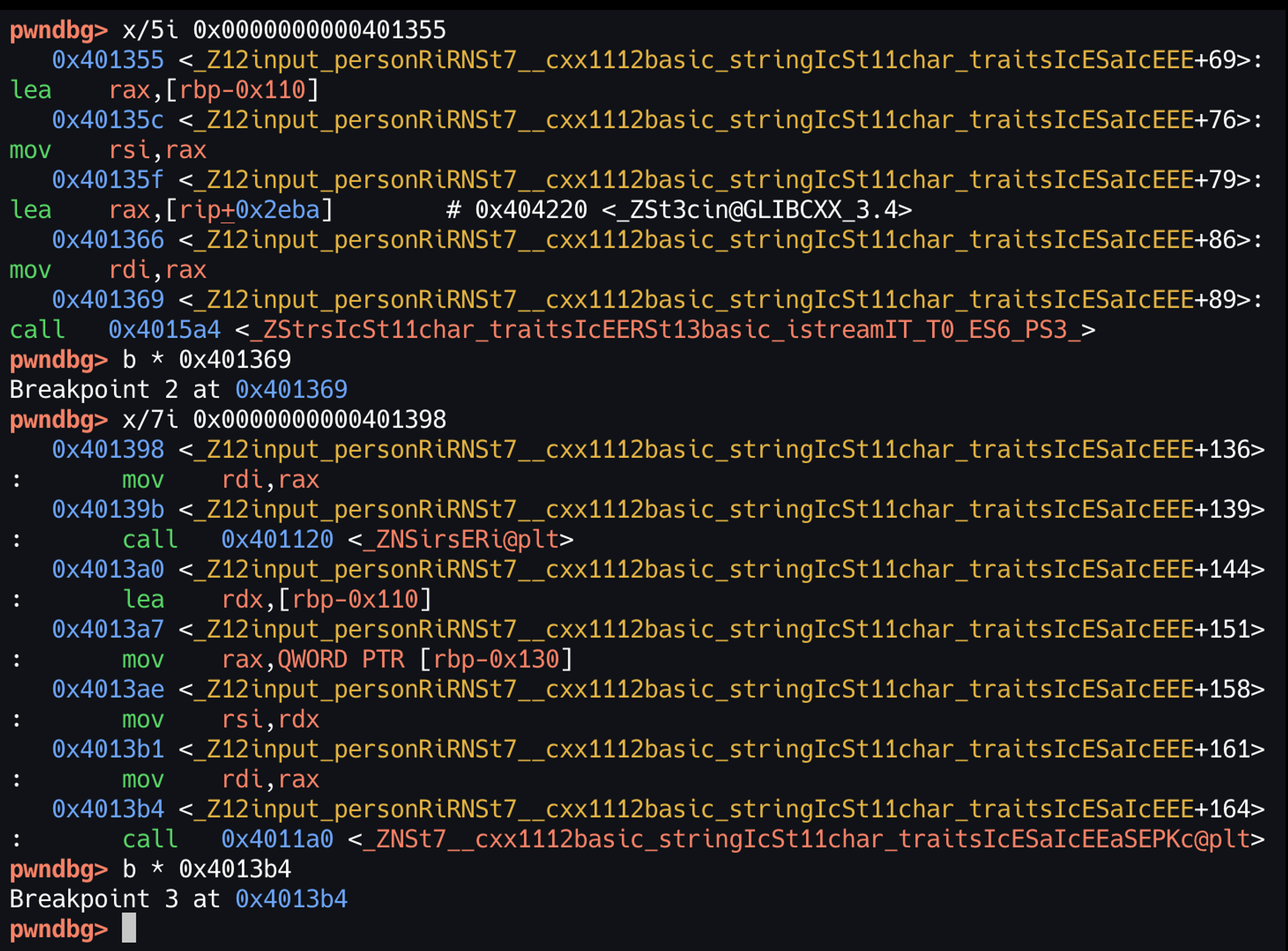 우선 disass input_person을 통해 _name을 입력 받는 위치와 name = _name을 진행하는 위치에 bp를 설정한다.