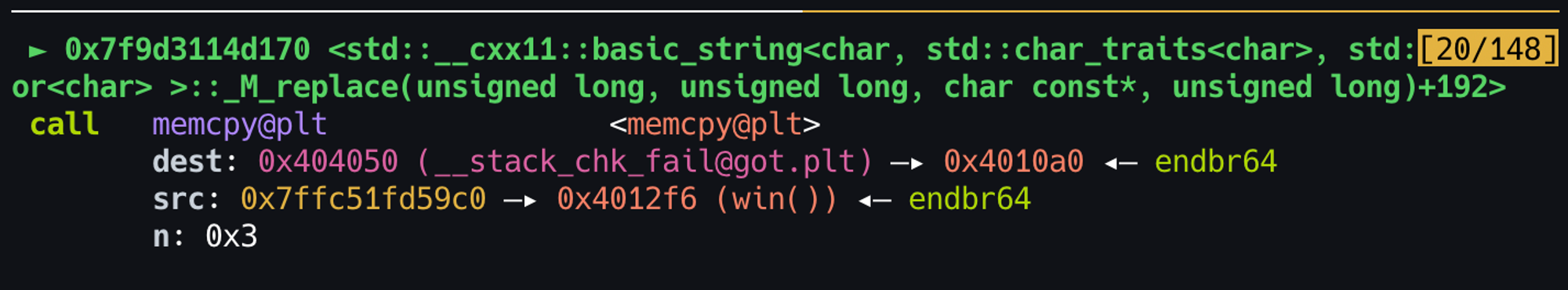 만약 _name에 입력을 받을 때 win 함수의 주소를 입력하고, BOF를 발생시켜 name의 string 객체의 문자열이 저장되는 포인터를 __stack_chk_failed 함수의 GOT 주소로 덮는다면 memcopy에서 __stack_chk_failed 함수의 GOT 값을 win 함수의 주소로 덮을 수 있을 것이다.