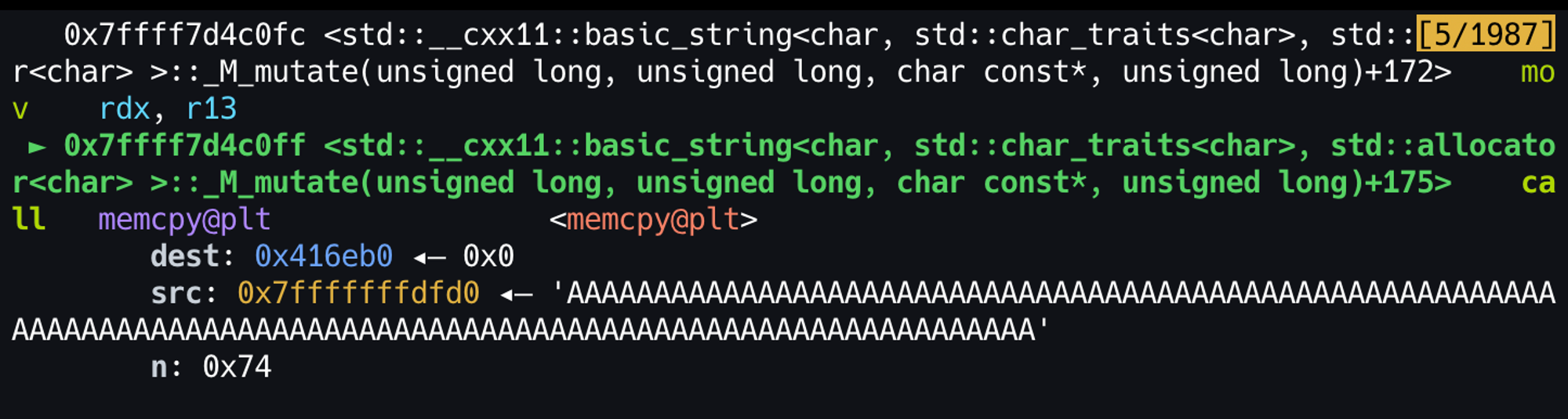 위 페이로드를 실행하면 다음과 같이 memcopy가 호출되는 것을 확인할 수 있다.