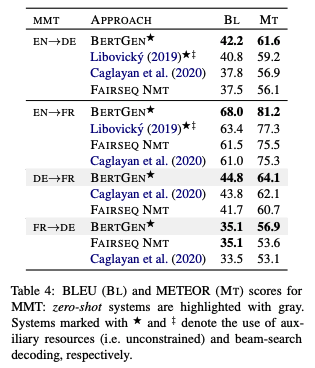 - 기존 BERT 계열 모델들과 달리 BERTGEN, 특정 MT corpus에 fine-tuned 되지 않음