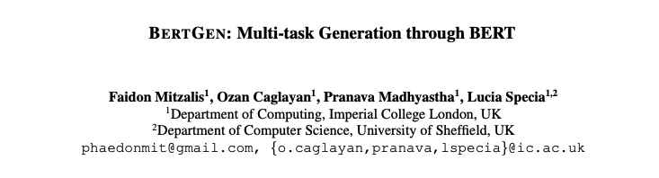 Mitzalis, F., Caglayan, O., Madhyastha, P., & Specia, L. (2021). BERTGEN: Multi-task Generation through BERT. arXiv preprint arXiv:2106.03484.