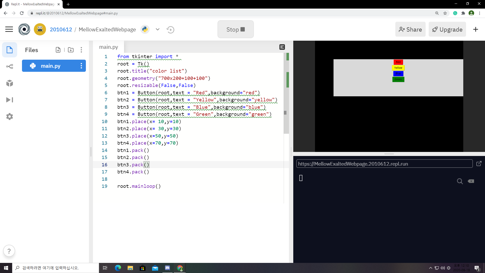 btn1.place(x= 10,y=10) # 버튼 위치 (안해줄경우 모두 겹쳐서 마지막에 있는 색인 green 버튼만 출력된다