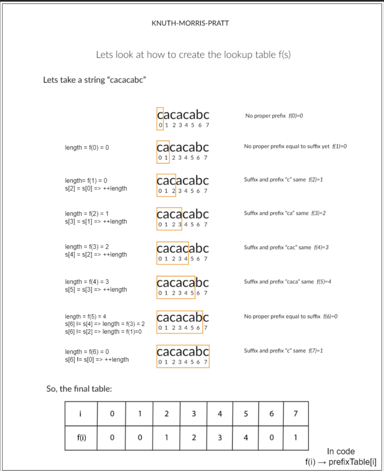 이를 위해서 prefix function 혹은 partial match table을 만들어야 한다. 그 테이블의 i 인덱스에는 i에서 끝나는 부분 문자열에 관한 가장 긴 suffix이자 prefix의 길이가 담겨 있다. table[i]의 값은 length이며, s[:length]는 현재까지 계산해낸 최대 접두사(접미사와 동일)를 가리킨다. 이 length는 어떠한 prefix의 길이(현재까지 일치한 접두사와 접미사의 길이)이기도 하면서, array에서 사용하면 그 prefix의 바로 다음에 나오는 문자를 가리키는 인덱스가 되기도 한다.