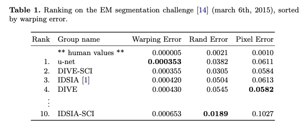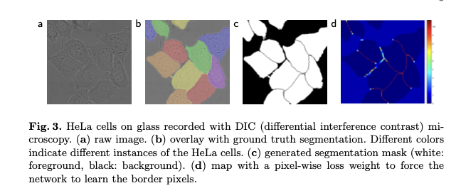 - 의료 분야의 sell segmentation에서, 동일한 클래스의 객체들을 분리하는 것이 어렵다는 단점이 있다. 저자들은 경계가 가까운 픽셀들에 높은 가중치를 부여하는 weight loss를 사용해 이를 개선했다.