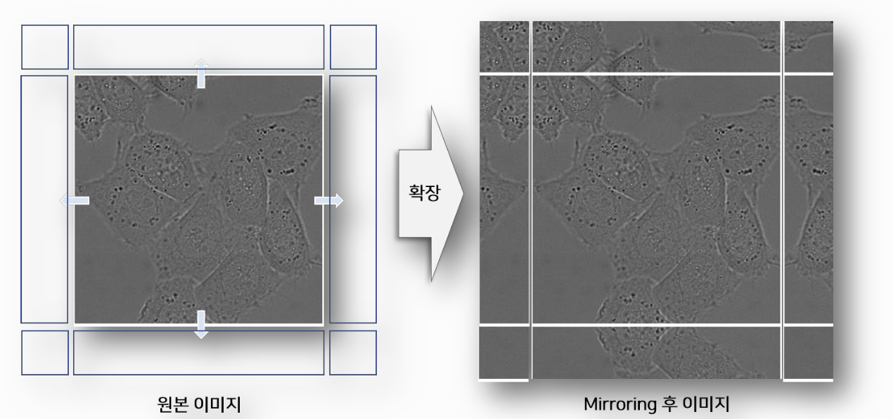 따라서 추가적으로 필요한 테투리 부분의 픽셀을 보충하기 위해, 경계 부분의 이미지를 좌우 반전하여 mirror 이미지를 생성해 원본 이미지에 붙여 넣는다.