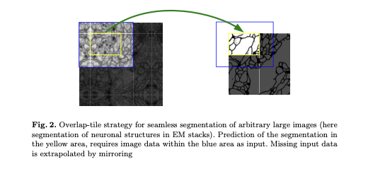 - Overlap-tile strategy 메소드를 사용했다. 테두리 부분의 소실된 부분은, mirroring extrapolate를 통해 붙여 넣었다.