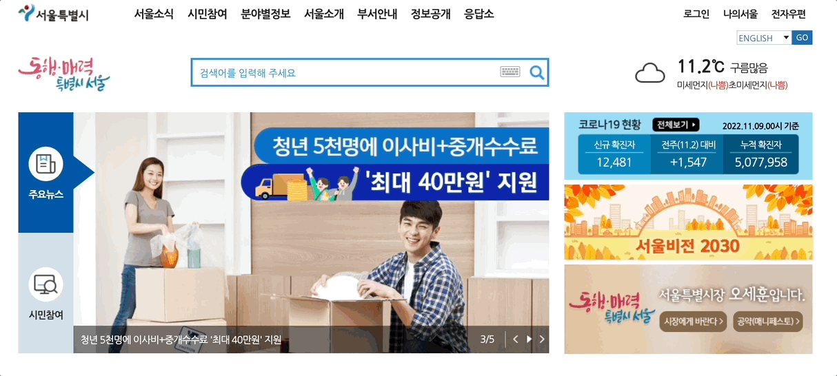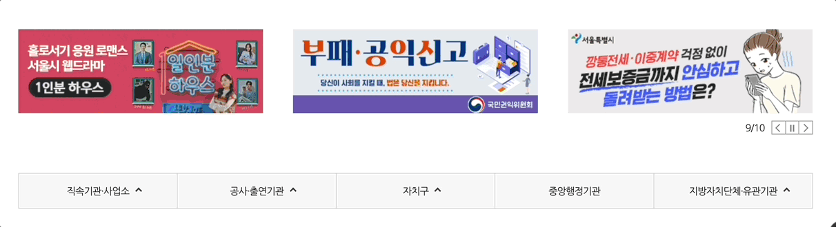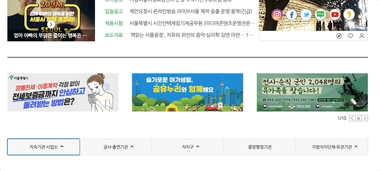 하단에 서울시 지원 슬라이드 영역의 페이지네이션을 swiper -> pagination -> type:"custom"으로 현재값과 전체값의 페이지를 계산하여 작동시켰다.