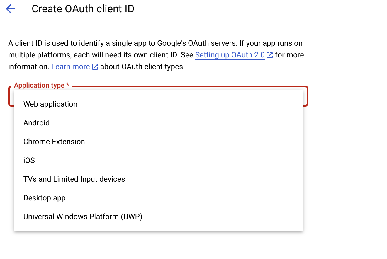 Next, navigate to the Credentials tab, then click Create Credentials → OAuth client ID. Select Web Application as the application type. For development purposes, I added http://localhost to the authorized redirect URIs to successfully establish a connection with Google Auth.