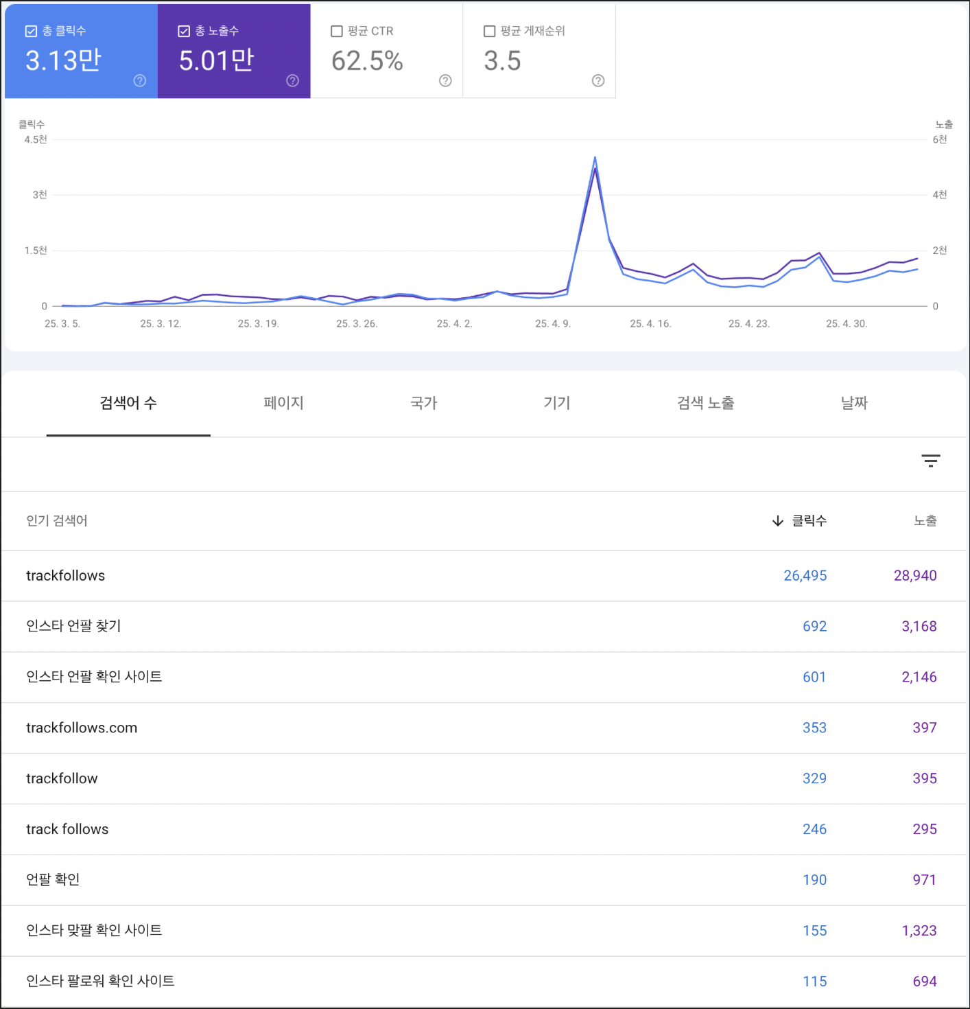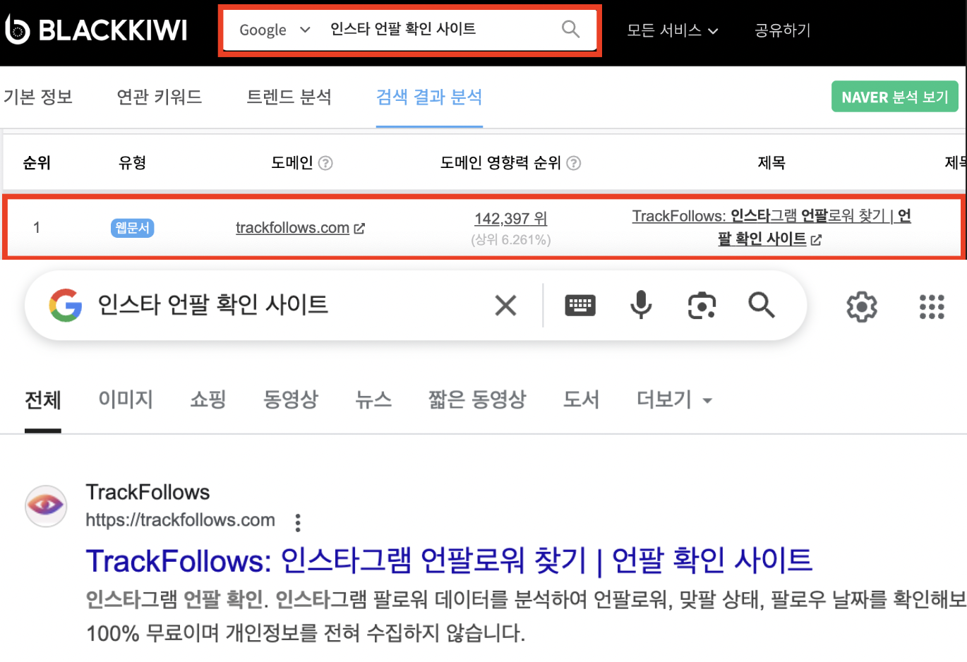 특히 '인스타 언팔 확인 사이트' 같은 주요 키워드 검색 시 내 서비스가 상위에 노출되기 시작했다.