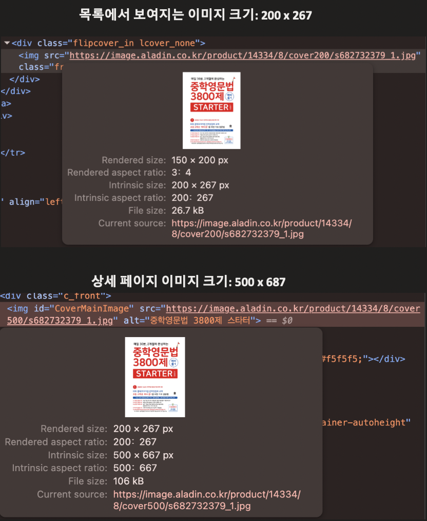 즉, 같은 책 데이터인데도 목록과 상세 페이지에서 불러오는 이미지 품질이 달랐다.