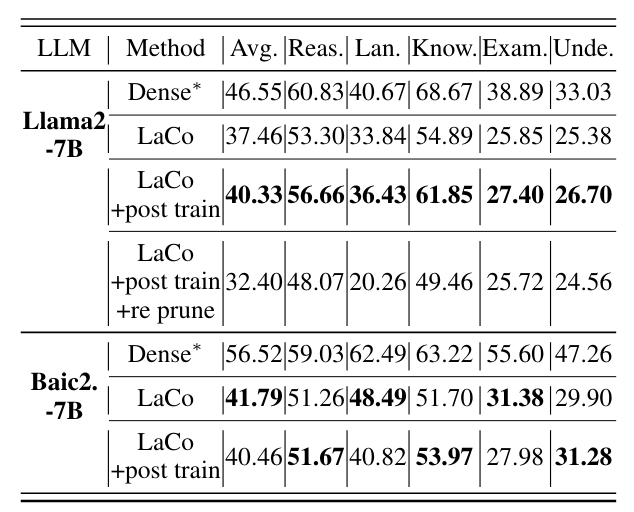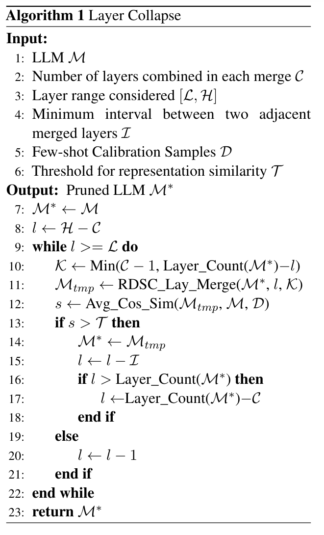 - 후방 모델 레이어를 이전 레이어로 병합하여, 모델 크기를 빠르게 줄이면서도 모델 구조를 유지하는 방법인 LaCo 제안