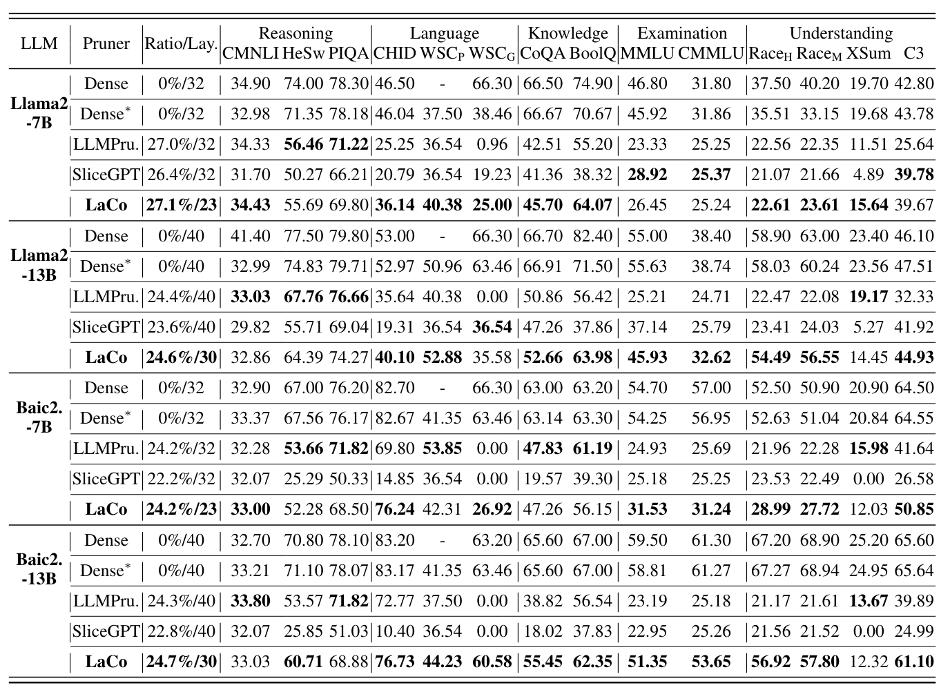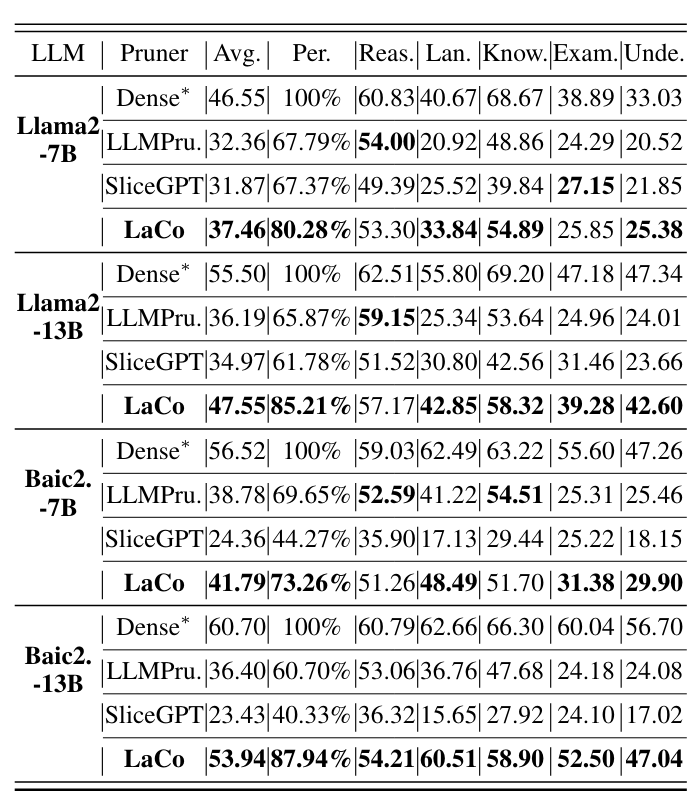 LaCo로 가지치기된 모델은 대부분의 벤치마크에서 70% 이상의 성능을 유지함으로써 Baseline 대비 안정성이 뛰어남