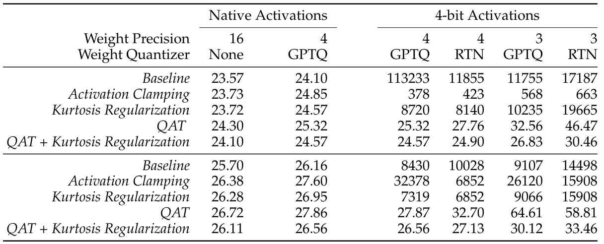 낮은 비트에서도 원래의 성능에 가깝게 동작하도록 하게끔 이용. 즉, 양자화 성능을 위한 목적으로 사용.- Activation Kurtosis Regularization