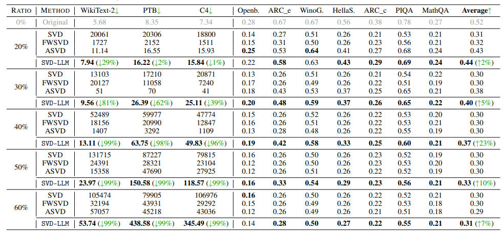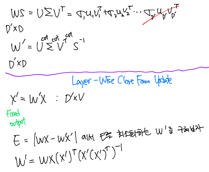 - 원래 출력과 compressed 된 출력의 차이를 최소화하는 W'를 구하고, 해당 W'를 기존 LLM의 W 위에 Override하여 Update 수행