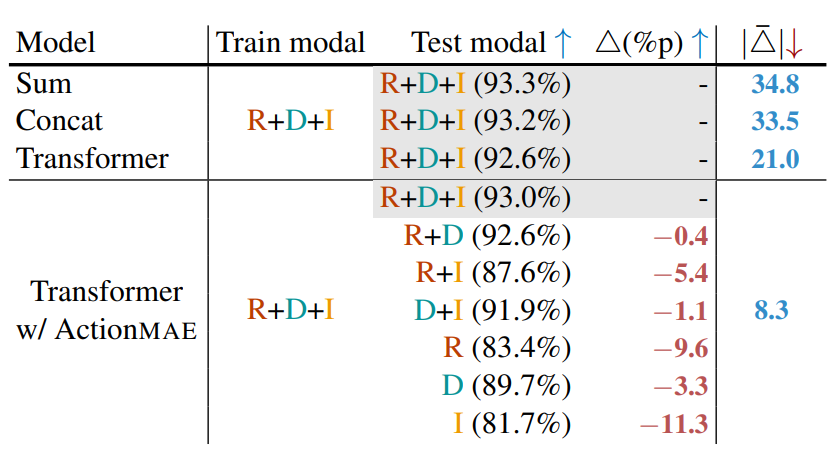 ActionMAE 모듈을 달았을 때, 빈 모달리티 예측을 포함하였으며, 높은 Robustness와 정확도를 보여줌