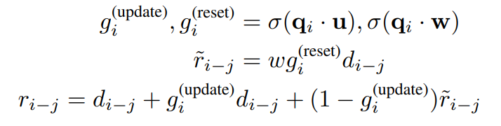 - 현재 timestep 의 Query 벡터에 trainable한 벡터를 각각 붙여서 sigmoid를 씌움으로써 Query에 영향력을 행사하는 Weight 로 만들어줌으로써, Update Gate, Reset Gate를 구현함