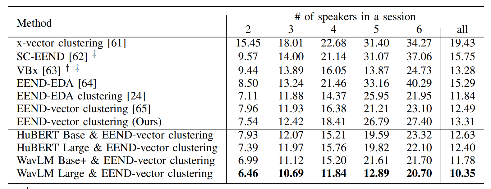 - 지표는 DER을 사용하였으며, WavLM이 SoTA를 보여주었음