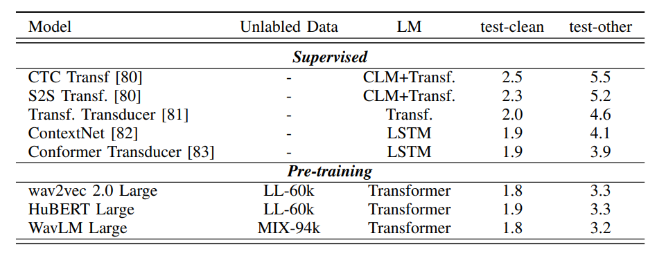 - HuBERT Large, wav2vec2.0 Large를 종합 점수에서 능가하여 sota 달성
