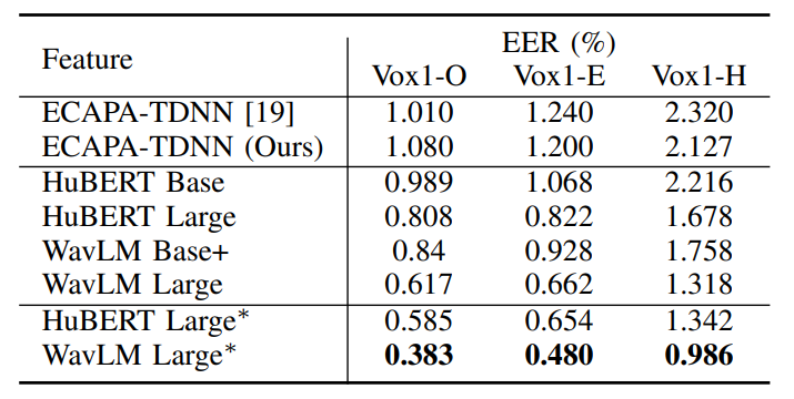 - WavLM의 Representation을 ECAPA-TDNN 모델에 넣어 Speaker Representation을 뽑아서 학습