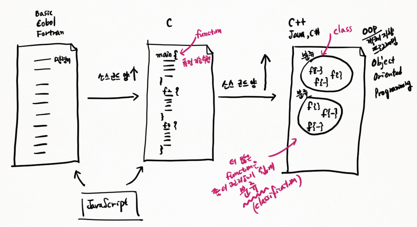 소스코드의 양이 더 많은 Java 등 언어 → function을 묶음으로 분류해 관리하는 최소단위 class 사용