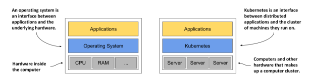 OS가 Scheduler를 통해 CPU를 할당해 주고 interface를 지원해 주는 것처럼 Kubernetes는 Server들을 Scheduling해 주고 interface를 제공해 사용자가 다음과 같은 infrastructure를 몰라도 되도록 해준다.