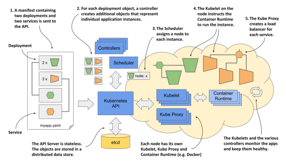 전체 object들의 description은 yaml이나 json으로 관리된다. 이것들은 보통 kubetcl(K8s의 cli)로 object단위로 쪼개지고, PUT이나 POST 요청으로 API서버에 전해진다.